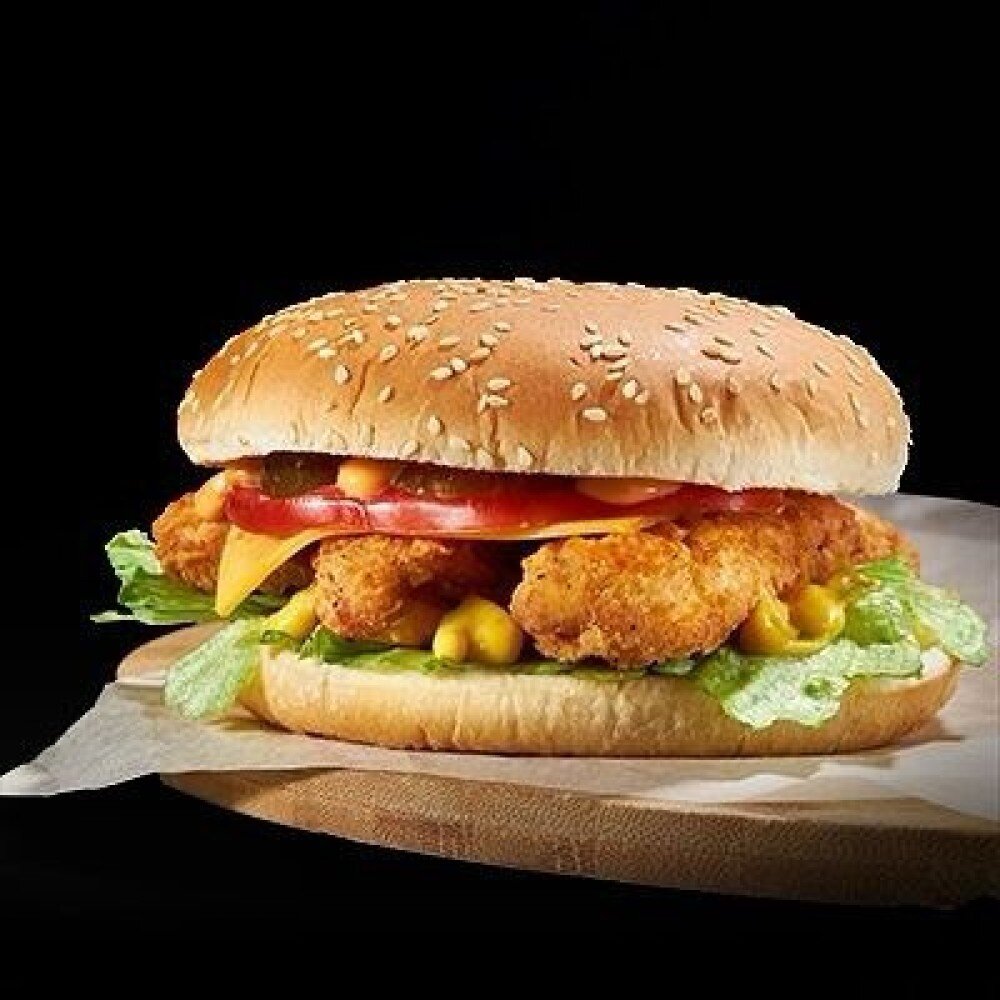 Булочка собственного производства, кисло сладкий соус, сыр, стрипсы, помидор, огурец свежий, лук жаренный, лист салата, сырный соус